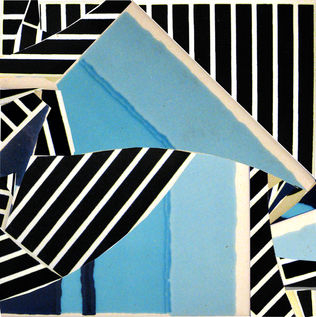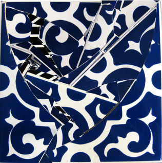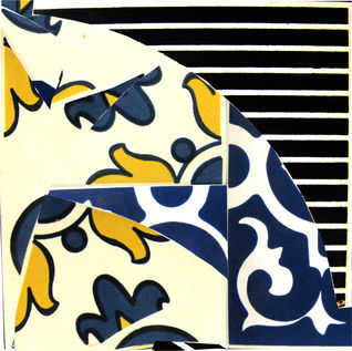 E criei três quadros que combinavam o descarte de azulejo com pinturas, simbolizando a área que seria ocupada por azulejos caso de fato tivesse a quantidade de azulejos prometida.