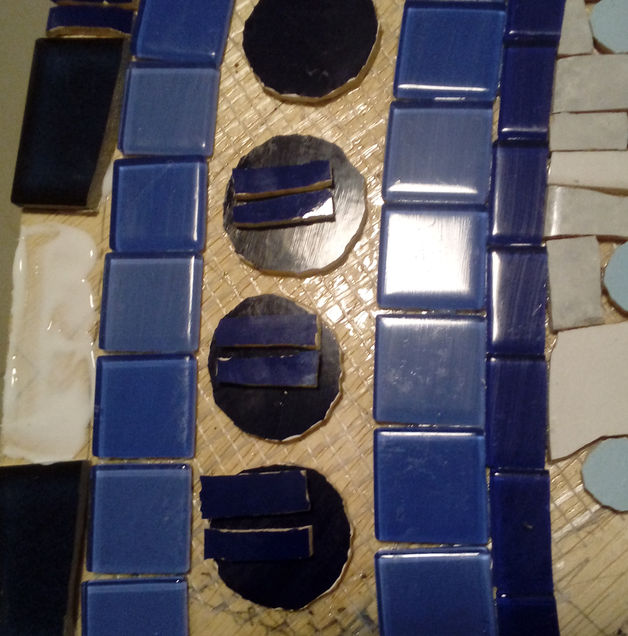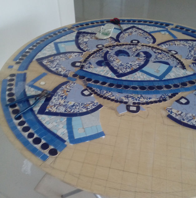 Mandala de 1,50 m de diâmetro feita de azulejos, espelhos e pastilhas de vidro. Imagem de inspiração foi enviada pela cliente, a querida Maria Araújo, fiz dois desenhos e este foi aprovado. Fechamos uma paleta de cor em tons de azul.